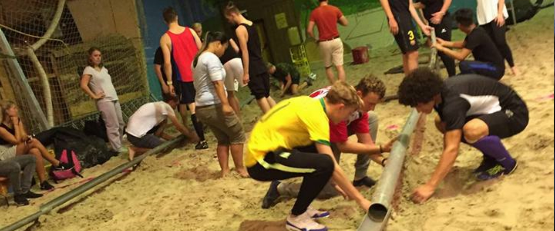 Klimparcours: dit parcours begint met verschillende zwevende autobanden, die met elkaar een soort brug vormen. Zonder het zand aan te raken moet met hulp van elkaar de overkant bereikt worden. Daarna volgt een hangende evenwichtsbalk. Daarna komen een aantal touwen met aan het eind het verlossende zand. Het aantal overgebrachte personen bepaald de winnaar.